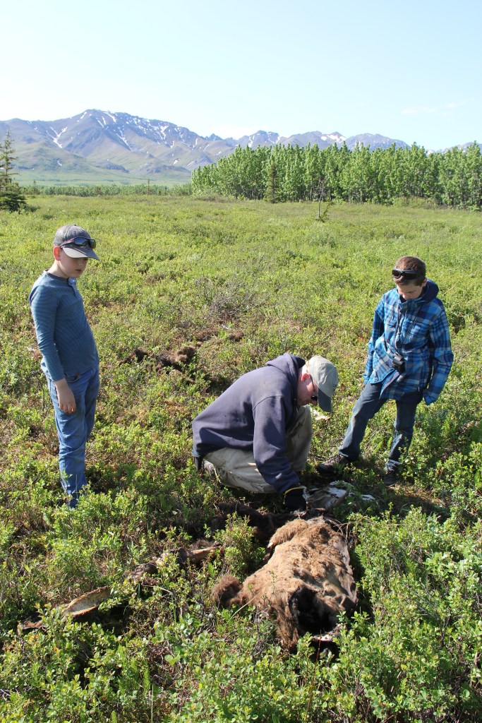 From a hilltop, we spotted it. A brown mass of fur and some white, sun bleached bones scattered about the tundra. Our camping trip in June to the Alaska Range held many adventures, and we were about to have another one- investigating the remains of a large dead animal.