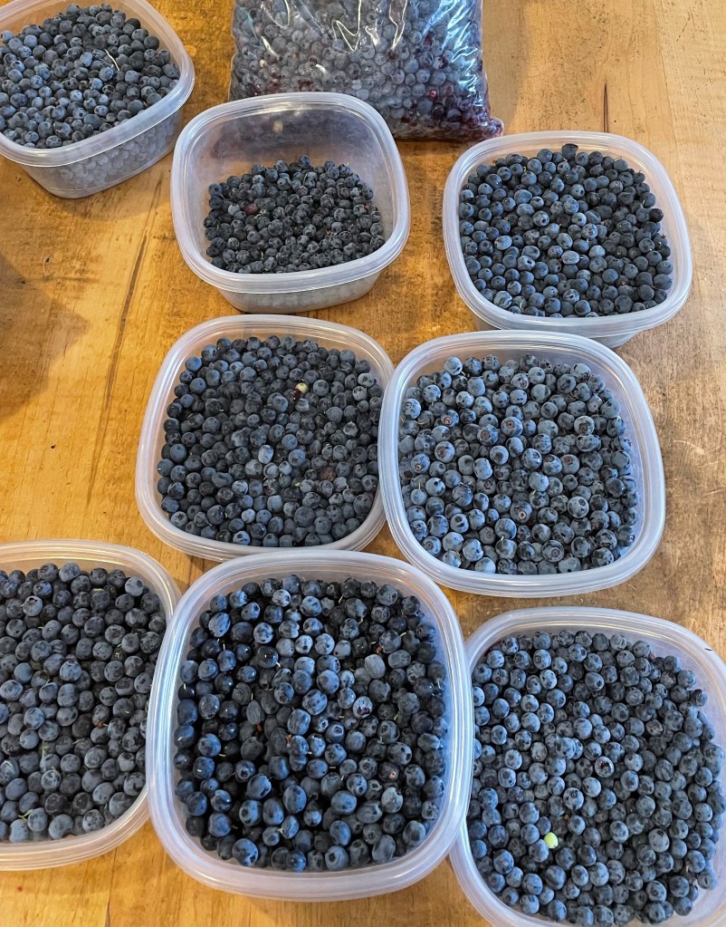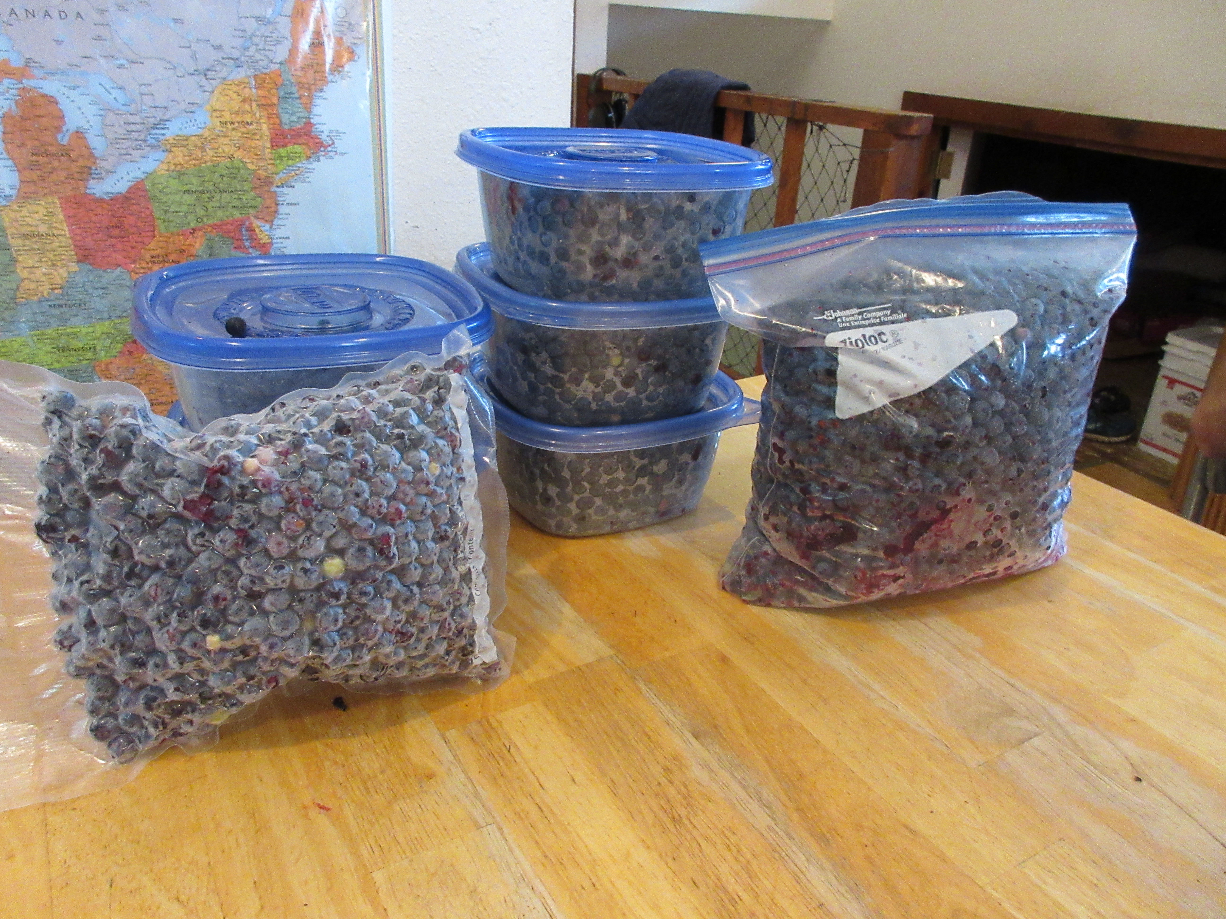 How do we store our berries? First, I spread them out on cookie sheets and freeze them in batches. I put them in freezer bags or vacuum seal them and store them in the freezer. I also make lots of blueberry jam. Some years we dehydrate them and eat dried berry snacks through out the winter.