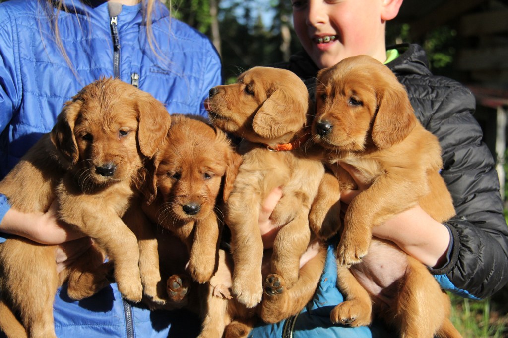 Our goal of raising goldens in Alaska is to provide healthy, high quality dogs to loving homes. We raise field goldens, which are dark red in color and are excellent family dogs as well as hunting companions of waterfowl and upland birds. This lineage of goldens has served as family pets, bird retrievers, therapy dogs for autistic children, avalanche rescue dogs, police “sniffing” dogs, and aviation flying companions. These dogs are adaptable, highly trainable, loving and gentle. Our dams are OFA and genetic tested.